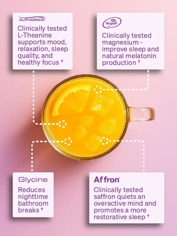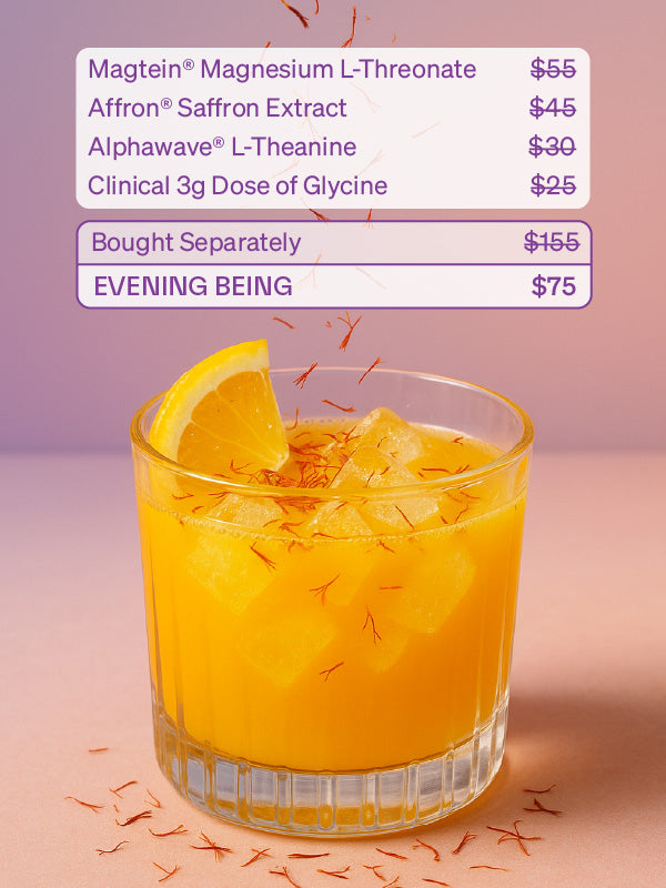 “I now look forward to the orange glow of Evening Being. I drift off within about 45-60 mins of sipping on this delicious nightcap! The theanine and magnesium keep me calm and cool while the specific form of Saffron keeps me asleep. I often don't wake up for 7-8 hours after I lay down my head!”