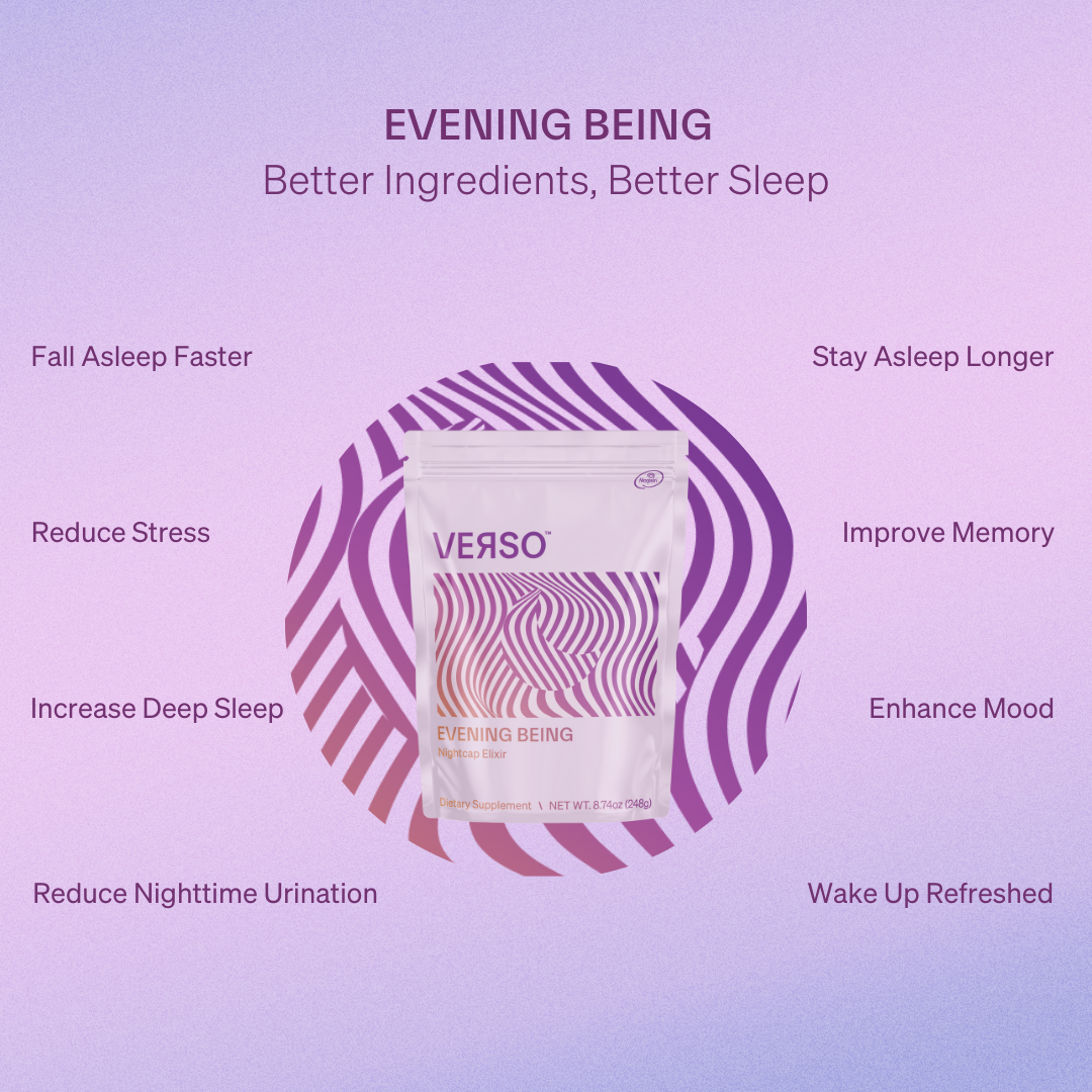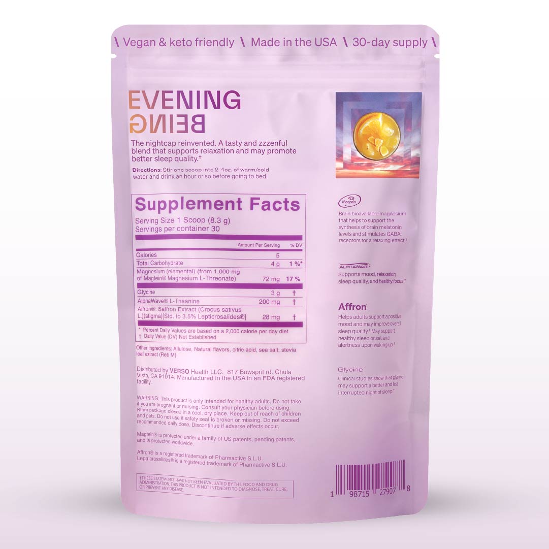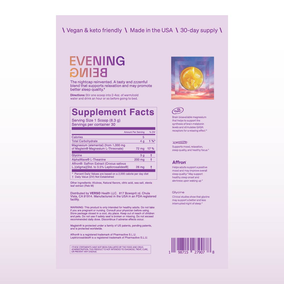 Unlike most sleep products that only help you fall asleep, Evening Being is designed for those who struggle to unwind and wake up during the night, unable to fall back asleep. It blends clinically-proven ingredients that improve sleep quality, reduce nighttime awakenings, and promote relaxation—without causing next-day grogginess.”